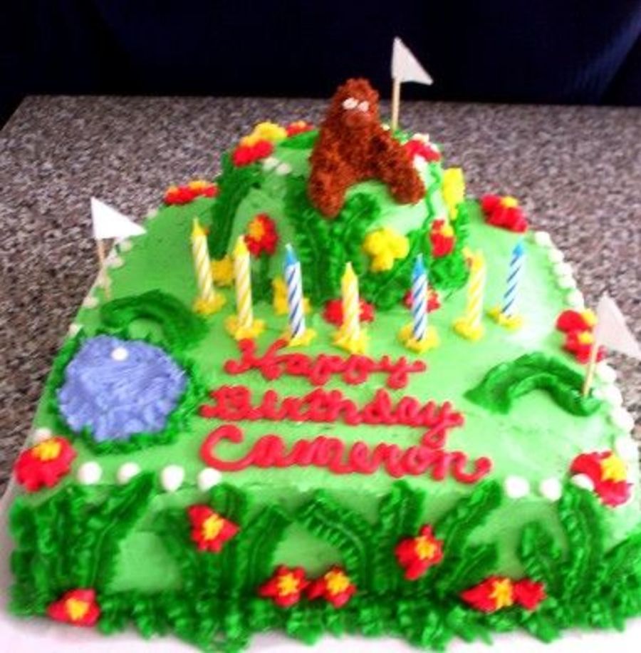 This was designed after I turned the cake out of the pan and it broke apart. The little boy wanted a putt putt golf cake so...I plopped the broken part of the cake on top with the gorilla and covered the cracks with ponds and flowers.