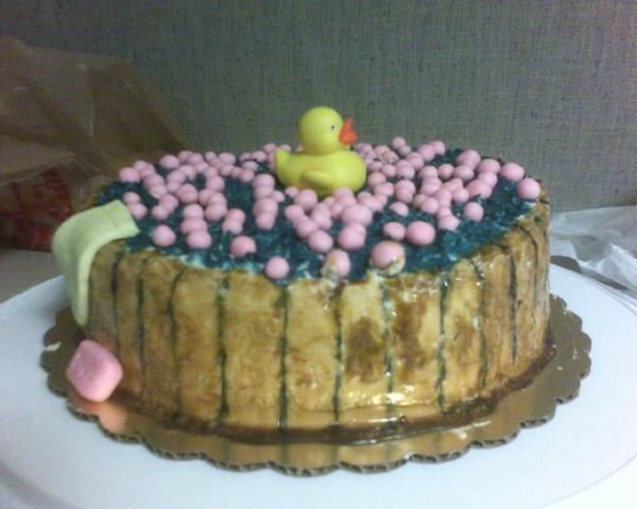 This cake was a PAIN! It is the second cake I have ever tried to decorate and I think I got in over my head. The first one was a fondant covered cake but the cake ripped in half and than the fondant ripped in many places. SO this is the second try and it is buttercream. I used gel I made for the sides, fondant for the bubbles, soap, and towel. The water is colored chocolate fondant. Please tell me what you think, everyone at work loved it but I just have that little voice in my head.
