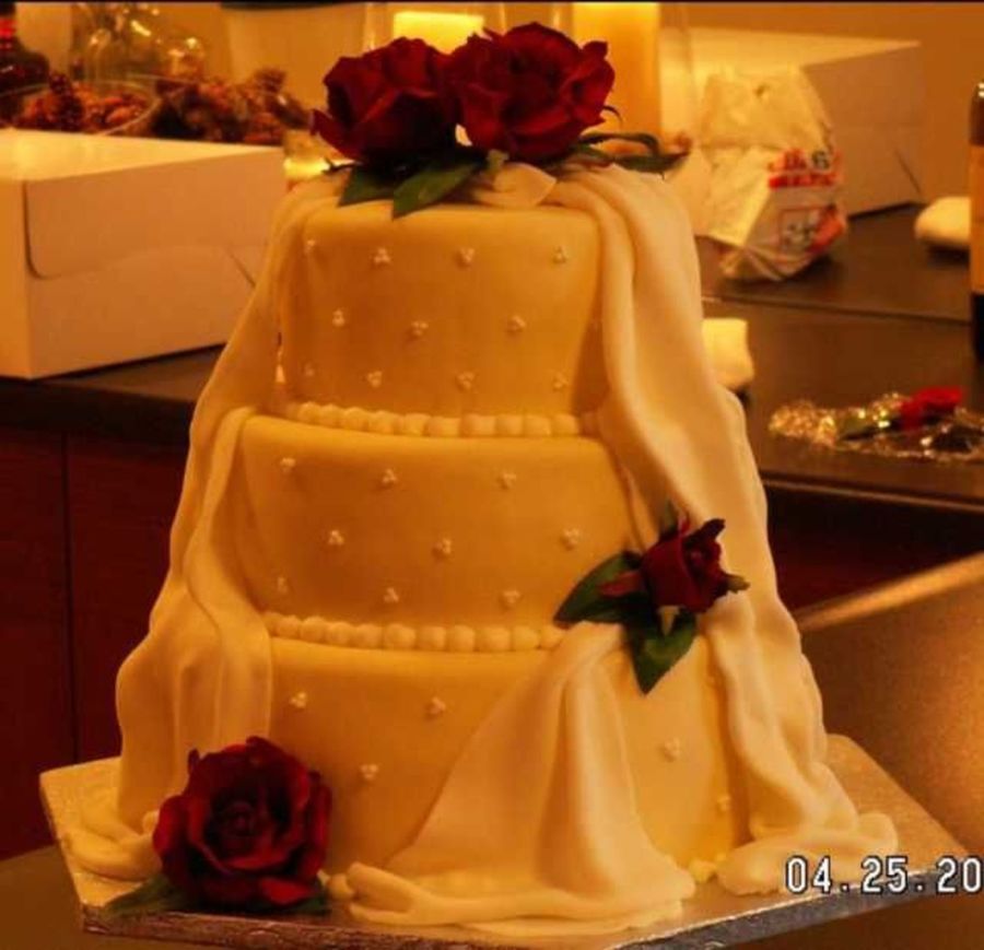Three tier white cake with lemon, strawberry, and vanilla custard fillings. Covered with white chocolate fondant and white fondant drapes.