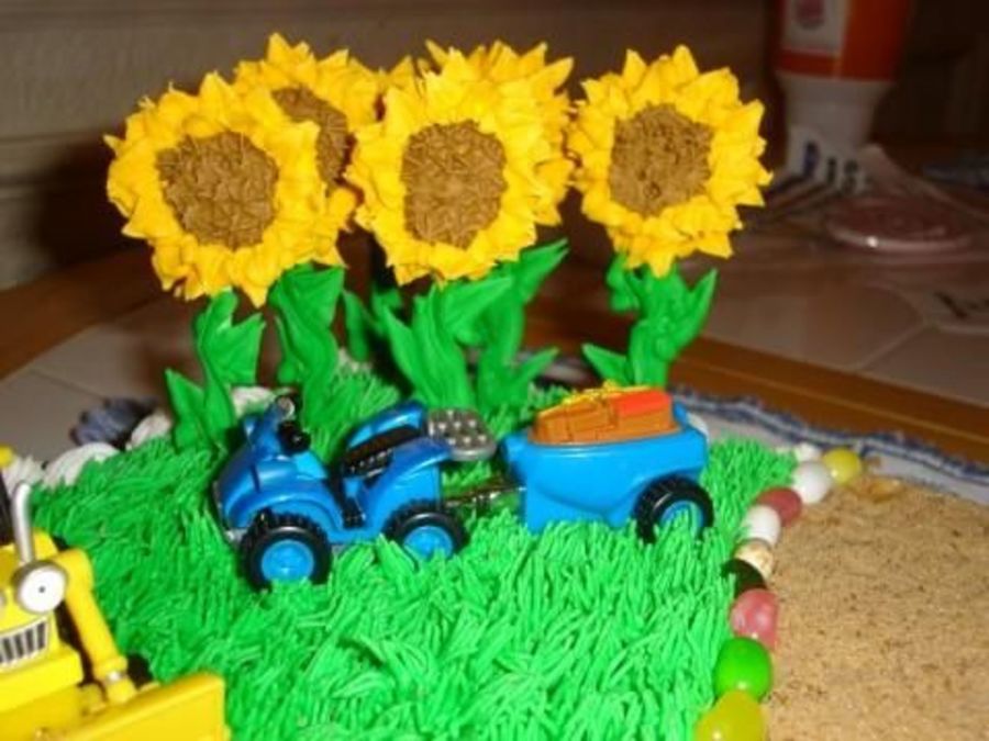 Used lolipop sticks and covered w/green royal icing. Used Royal icing and made sunflowers laying flat. Once dried, they stood up PERFECTLY!
