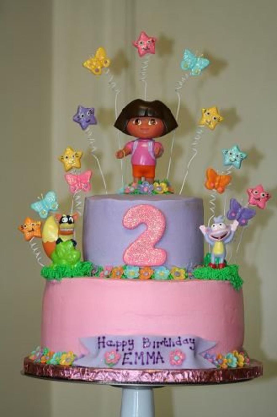 Done for a little girl turning 2. 10 inch round double layer. One layer is WACS and the other is Dark chocolate. 6 inch round double layer same flavors. Buttercream Dream frosting, Cookies and cream filling. Number 2, butterflies, explorer stars and flowers done in fondant and all dusted with pixie dust. I LOVED making this cake, soo much fun!!