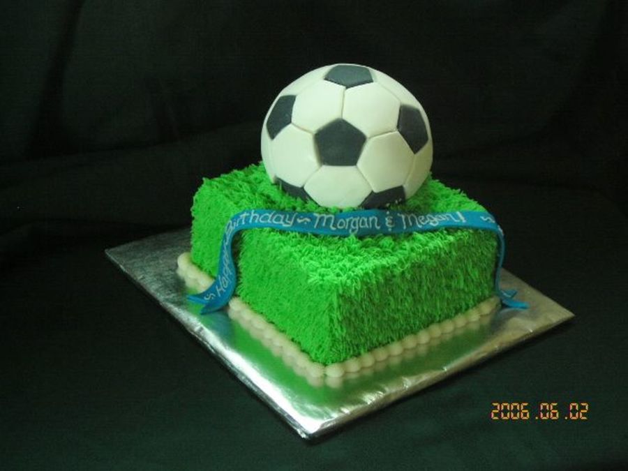 A soccer ball cake I did with BC grass and fondant on the ball, for two classmates of my kids who love soccer. Chocolate cakes, one with cherry and one with cheesecake flavored filling. I'm happy with it.