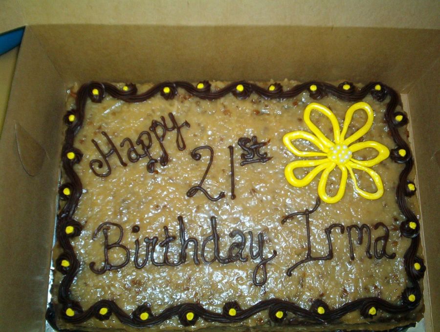 LOVE the dark chocolate writing with the little yellow color on this German Chocolate Cake! Nice Job!