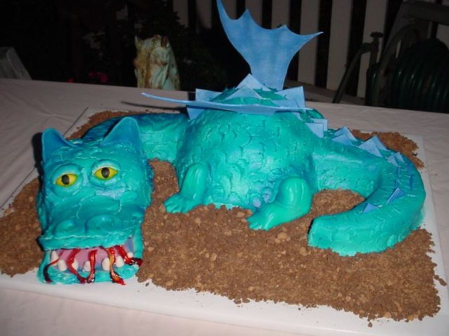 My nephew requested a blue fire breathing dragon, so I tried to give him that. Wings, eyes and spikes were made with the new Wilton Premade Gumpaste. Legs, ears, and teeth were made with fondant. Mouth was a piece of metal bent and iced on top, fondant inside. Fire (or what I wanted to be fire) was thick gelatin brushed on plastic wrap. I used several sizes of round cakes to make it.