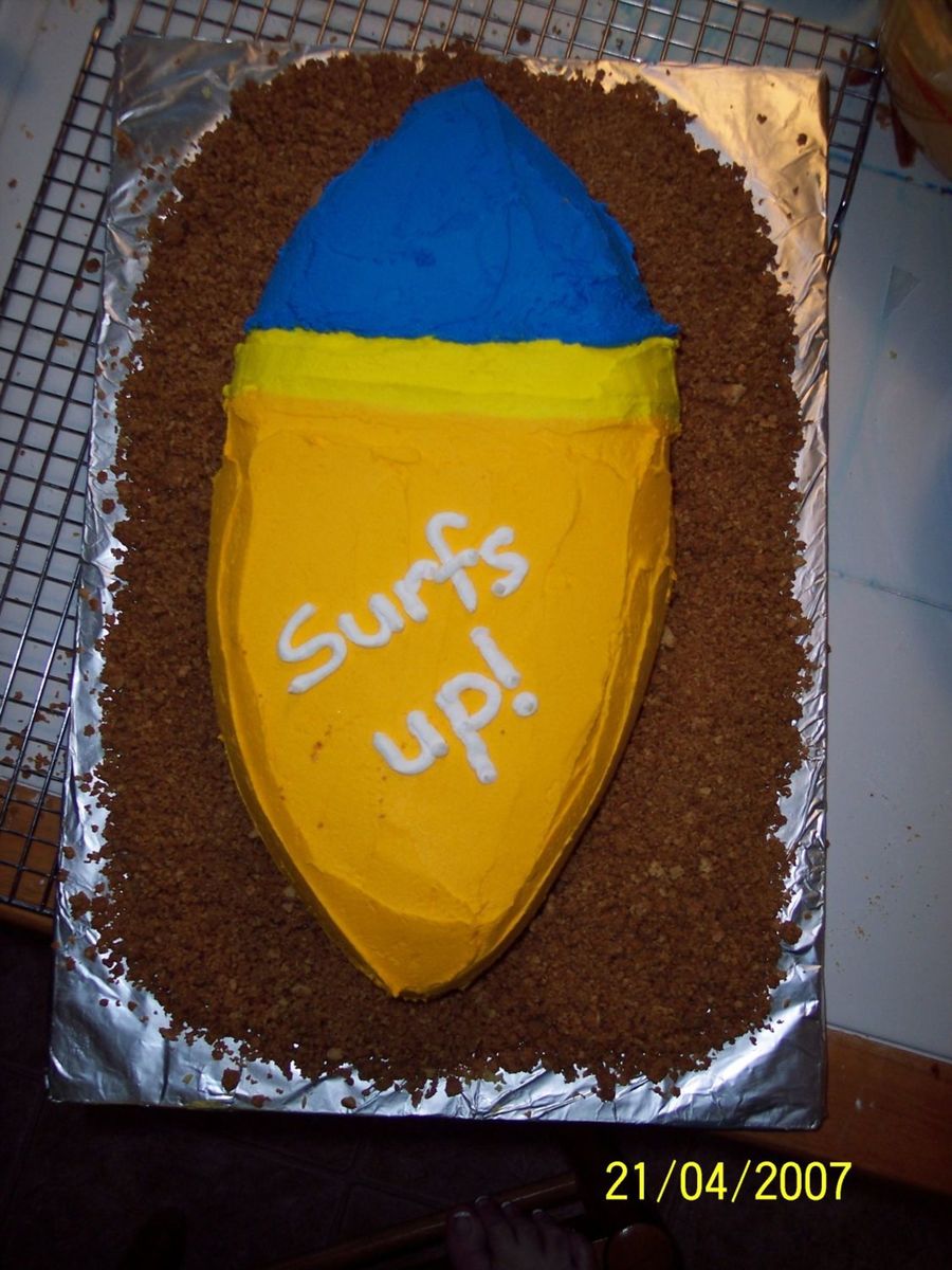 Surf board cake made with 11x15 in. sheet pan cut. Graham cracker sand and buttercream icing.