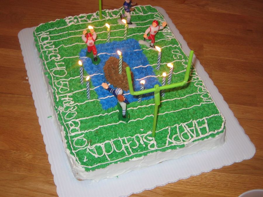 I made this cake for my son's 10th birthday. He was in his first year of football at the time. It didn't turn out as well as I would have liked. It's white cake with BC icing.