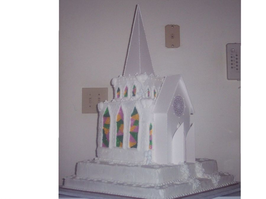 the chapel and the steeple are cardboard from the catherdral cake kit, held together with royal icing. the rest is cake and icing. (except for the little plaste angels)
