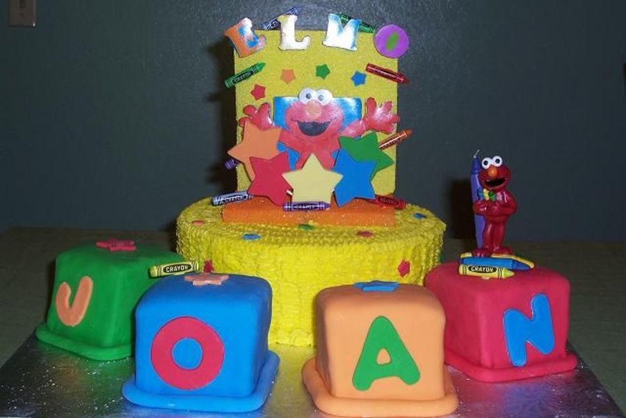 8" round cake with a 6" square pan cut in four to make the blocks. The center piece was made of "styrofoam" and fondant with an invitation picture.