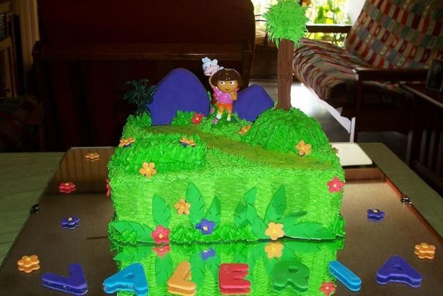 A 10" square pan. The hills are cake covered with fondant. And the tree is a styrofoam ball with a dowell covered with royal icing. The leaves and flowers are made of fondant.