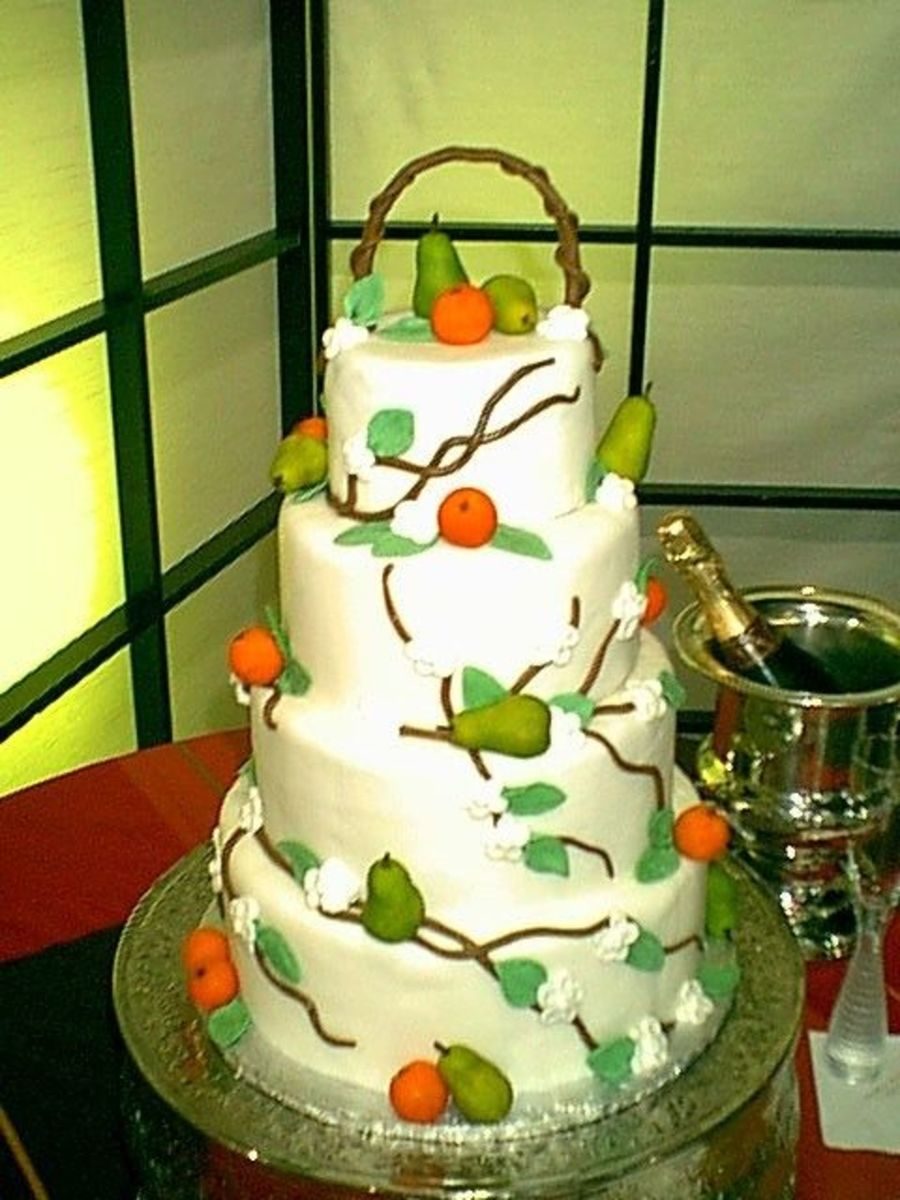 Fondant covered cakes. Marzipan vines & leaves. Each fruit was hand made from coconut macaroons covered with a thin "skin" of marzipan. Painted each pear & orange with thinned out paste colors. Topped with a whole clove "stem". The design was based on a cake of Gady's as featured in the JC Penney's recent bridal campaign. The reception site was decorated with real pears & oranges, so it all tied in nicely to the whole theme.