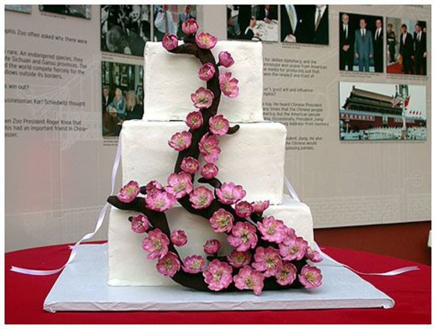 Peanut butter cake, raspberry filling, BC icing. Chocolate fondant w/tylose branch, gumpaste cherry blossoms. This cake was a nightmare. The wedding was at the zoo, and I was told I would be able to pull my car to the reception site. Wrong. I had to carry this cake through the China Exhibit, in Memphis, in JUNE. It was hot and humid, and by the time I got to the table the tiers had shifted a little. Nothing I could do at that point - so here it is. I'm also not happy with the branch, it's out of proportion.