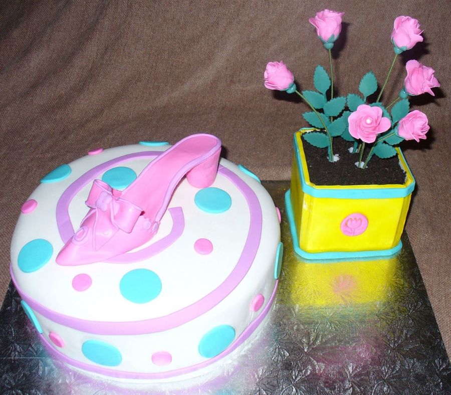 I made this cake for my fiance's birthday. The round cake is double layer carrot cake with cream cheese filling covered in fondant. The shoe is made from gumpaste. The flower pot is double layer chocolate cake with cookies and cream filling covered in fondant and the roses are gumpaste.