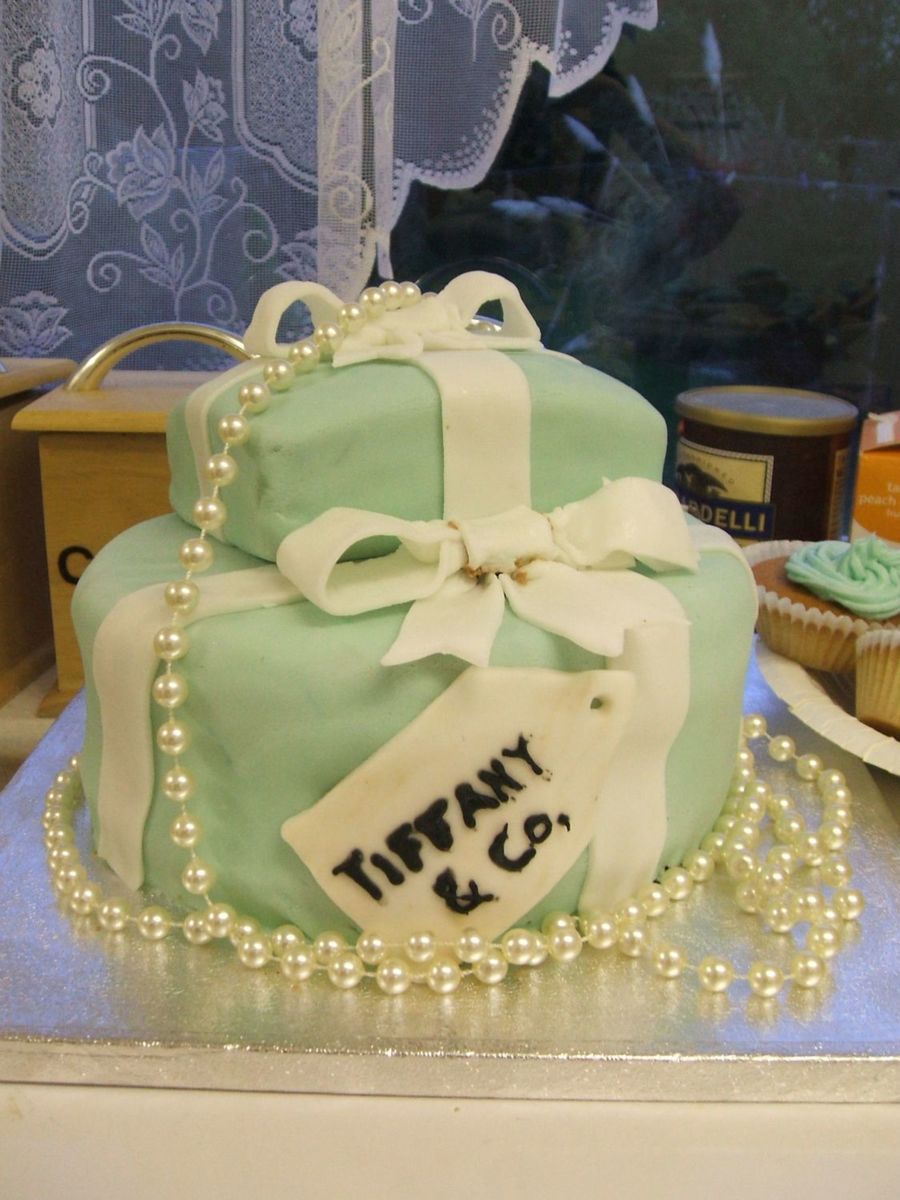 Cake I made for my Tiffany's themed party! Turned out pretty good in the end and I even found a good use for my favourite thing - pearl dust!! The pearls around it are just a necklace i had - thought it looked better with those on as well! It disappeared pretty quick so I'm very chuffed.