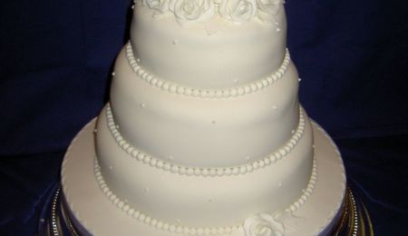 9", 7", 4" fruit cake covered in marzipan and sugarpaste. Sugarpaste roses and plastic couple - at brides request!