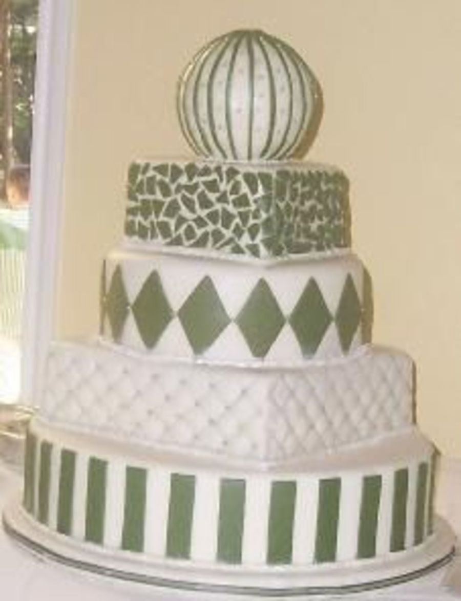 this cake was done last weekend for my friend's wedding.I had so much trouble with the moss green colored MMF.it was very pliable and smooth execpt when I would roll it out and put it on the tier,it fell off.after several hours and a couple of tries,i decided to cover that tier with white MMF. this was a firm textured yellow cake and all covered with MMF.