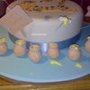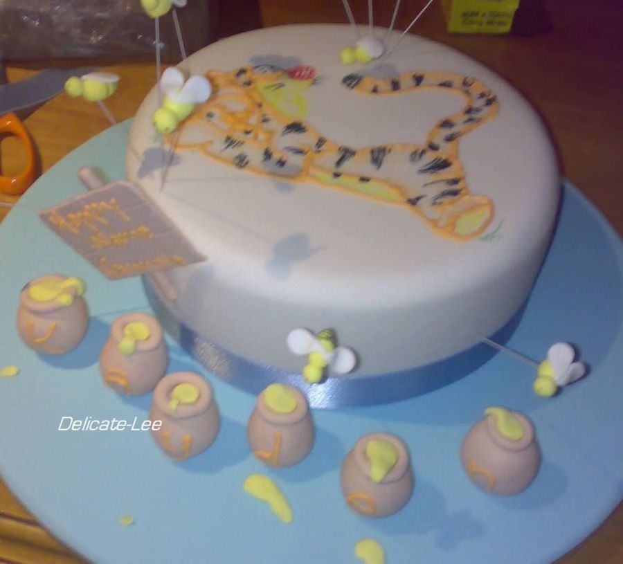 This cake was for a name giving. I painted tigger on with royal icing and then made the little bees on wire, honey pots( that spelt out his name) and the old post sign out of fondant.
