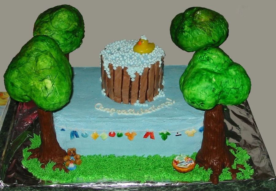 mmf trees, tub- chocolate on chocolate cake covered in chocolate fondant. base- vanilla sheet cake cut in half and stacked BCI