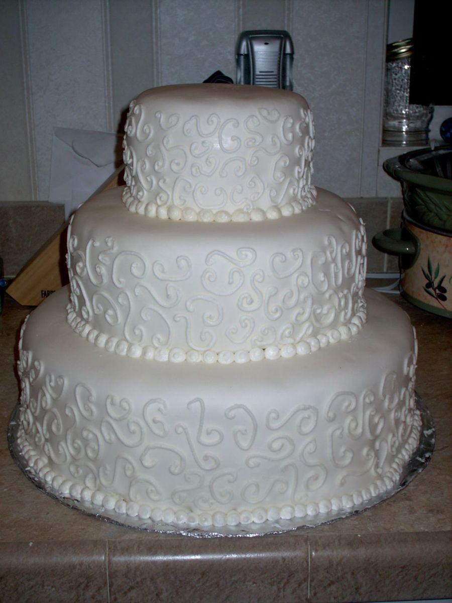 This is my first ever attempt at a stacked cake. It is Red Velvet and French Vanilla, filled and frosted with BC and covered in MMF. The scrolls and border are also BC.