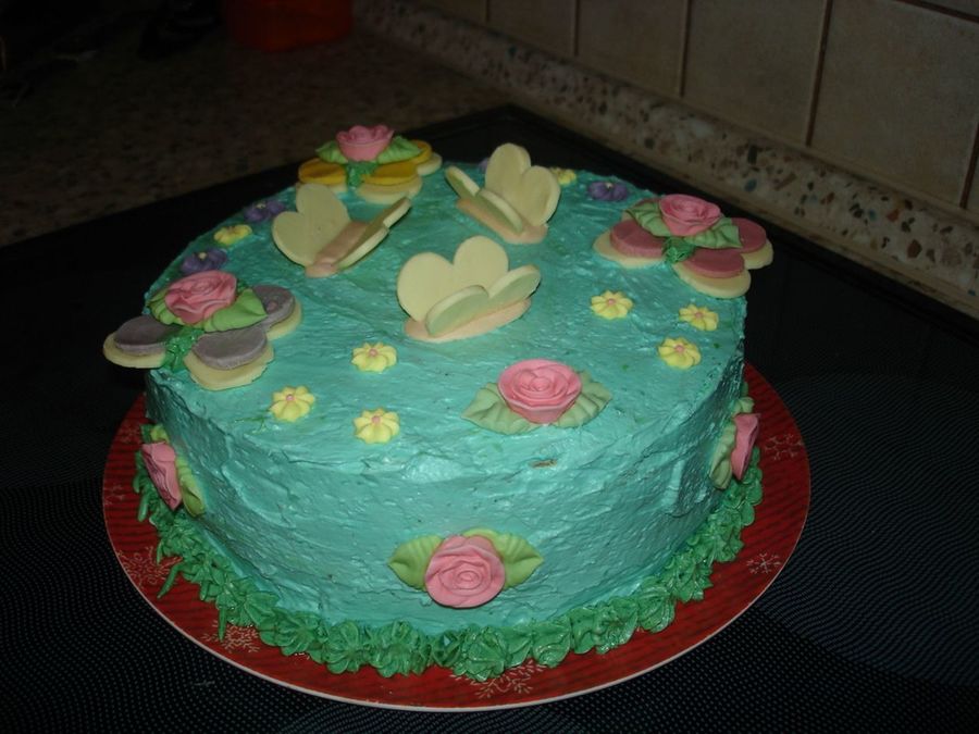 for my niece she wanted butterflies and loves blue color, anyway not so perfekt but everyone liked, flovers are store buy and rest is white chocolate colored,cake is chocolate with nutela flavored butercream