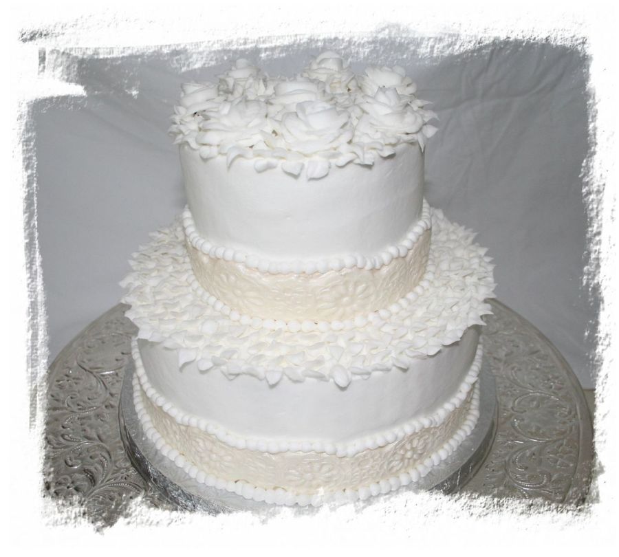 This was a 10 and a 6 inch for 50 people. Leaves on top with piped roses with Hershey Kiss centers.