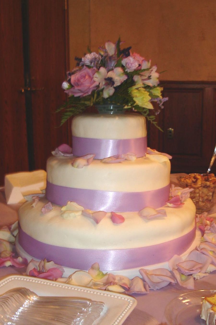 Could not have asked for a nicer bride to work with for my first wedding cake. She wanted something nice and simple and I was fine with that...although lots of embellishments cover up mistakes! :) Struggled a bit with the bottom layer (14inch.) My mmf was too thin and the cake showed very very lumpy!! Ended up adding another layer of mmf to cover the lumps. Thank heavens for flowers and ribbon right? Any suggestions would be appreciated! Bride loved it & that's all that matters! Had fun making it too!