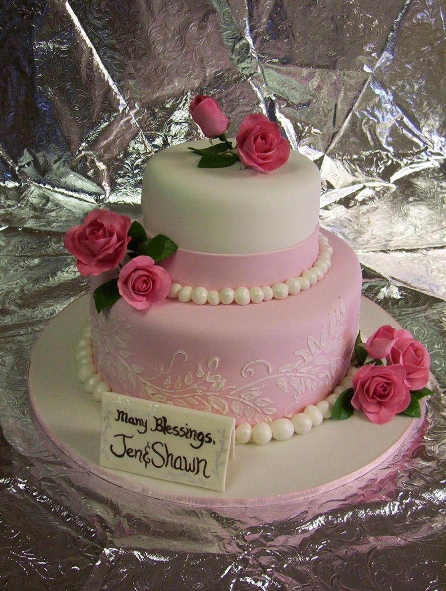 This bridal shower cake is covered with fondant. We made the roses and "place card" out of gumpaste. I made this cake with my husband, Justin...we make just about every cake together. He is "Rockstarcakes" on here...if you want to check out his work :)