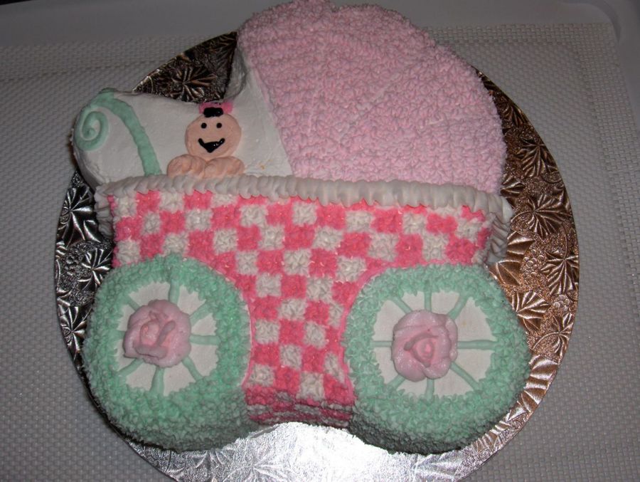 This is a cake that I made for a baby shower - they want to go with a buggy because it would match the chocolate buggy boxes that I made for the party favors. They choose the basic pattern, I choose the two tone pink colors to compliment the chocolate boxes.