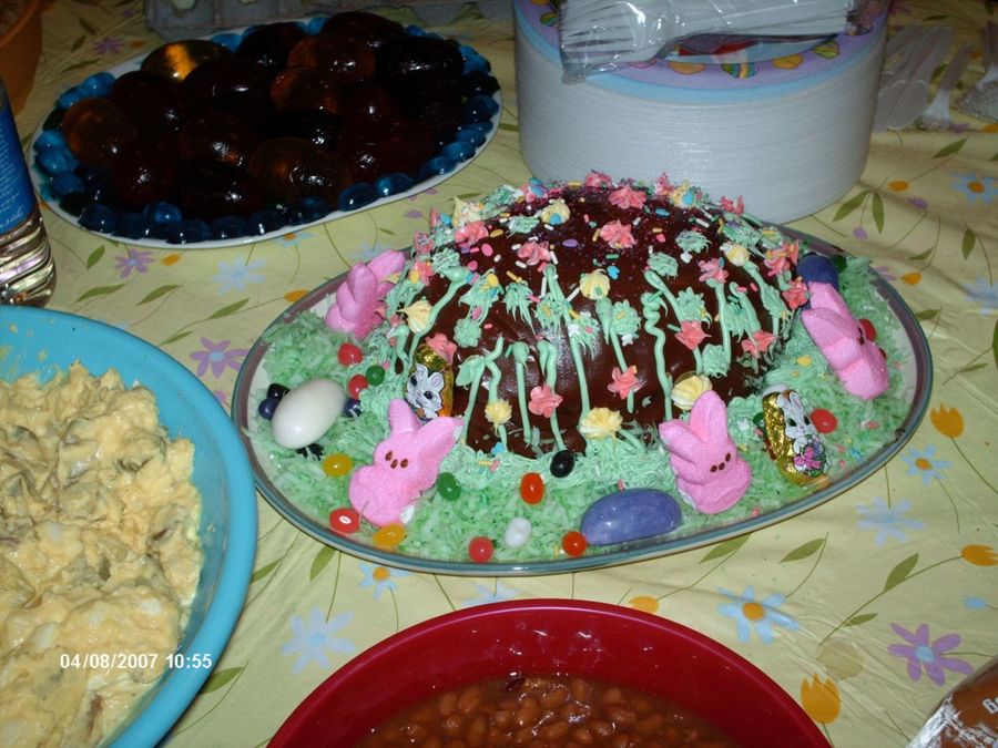 so here is my diaster of an easter cake this year I arrvied in kansas late saturday and threw this cake togther in about 5 mins sunday after noon I had my sister bake it for me and it came apart when she tried to take it out of the pan so its kinda pieced togther I used can frosting and a ziploc bag to squezze from but it was to fun I was laughing hysterically the entire time and whats easter without the egg cake.