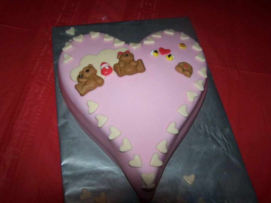 Heart shaped red velvet filled with cream cheese filling, bears and bees are made from mold.