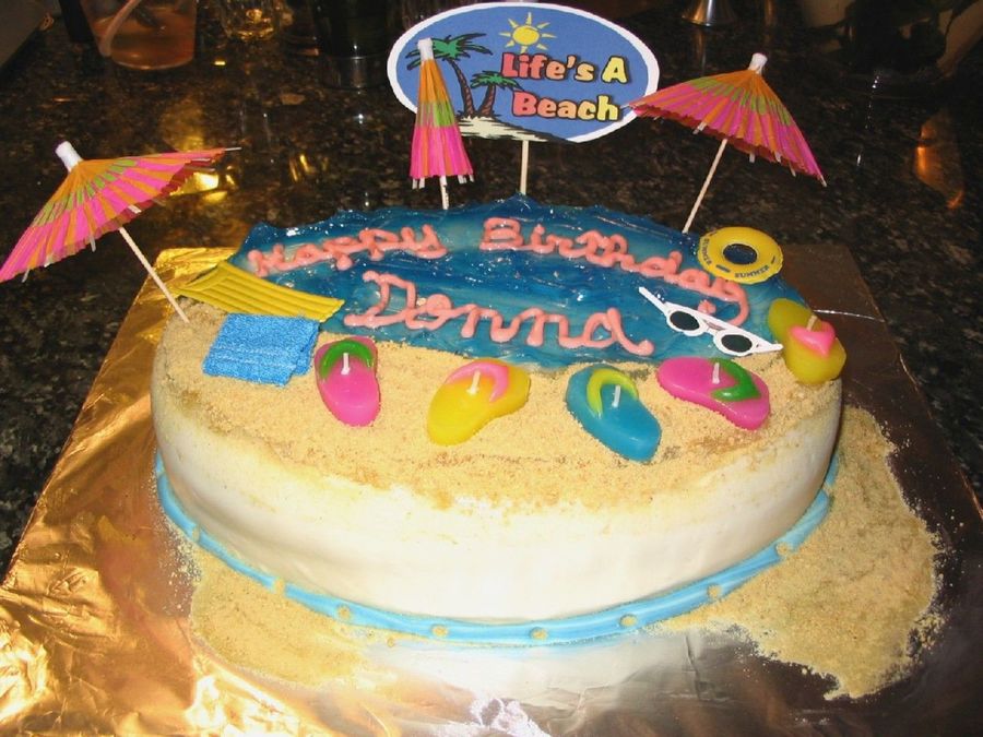 A cake for the beach bums. This cake was covered in fondant and i used piping gel for the water. The sand is graham cracker crumbs and the sandals (candles) and other decorations i bought.