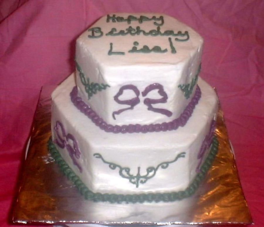 This was a birthday cake for the monthly birthday potluck at work. I wanted to practice stacking cakes for an upcoming wedding. It's a good thing I did. I had a mini disaster when I tried to decorate both tiers at once and on a tilted turntable. Don't ask me why I did that, but the top tier slid off and landed upside down onto the counter. Live and Learn.
