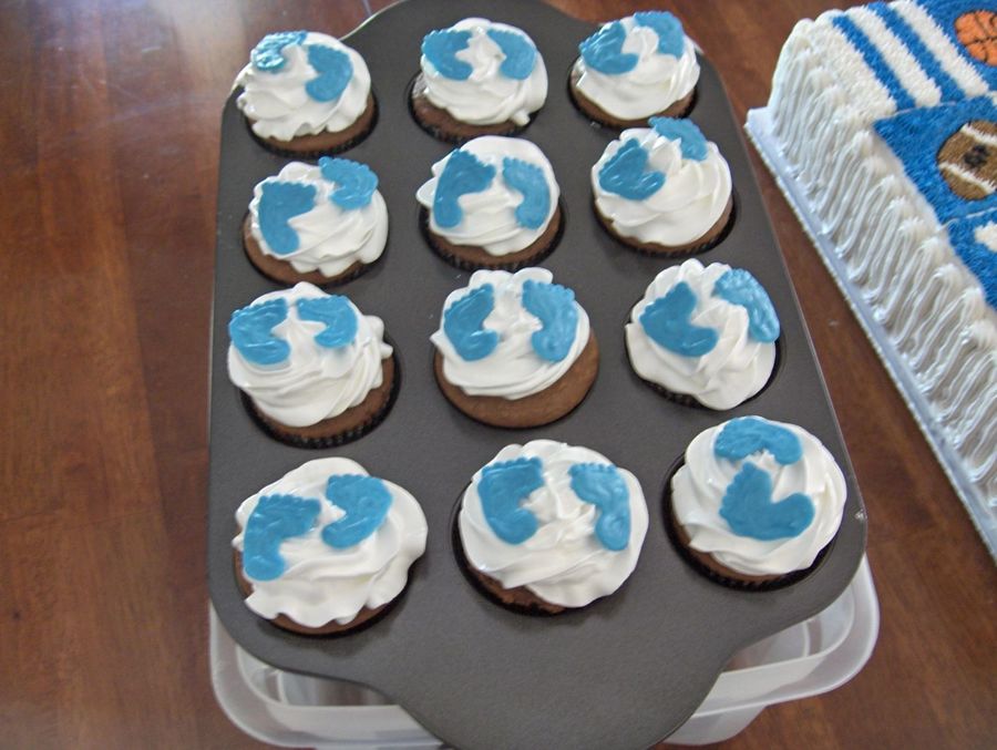 foot prints made out of almond bark. Chocolate w/ chocolate chips cupcakes.