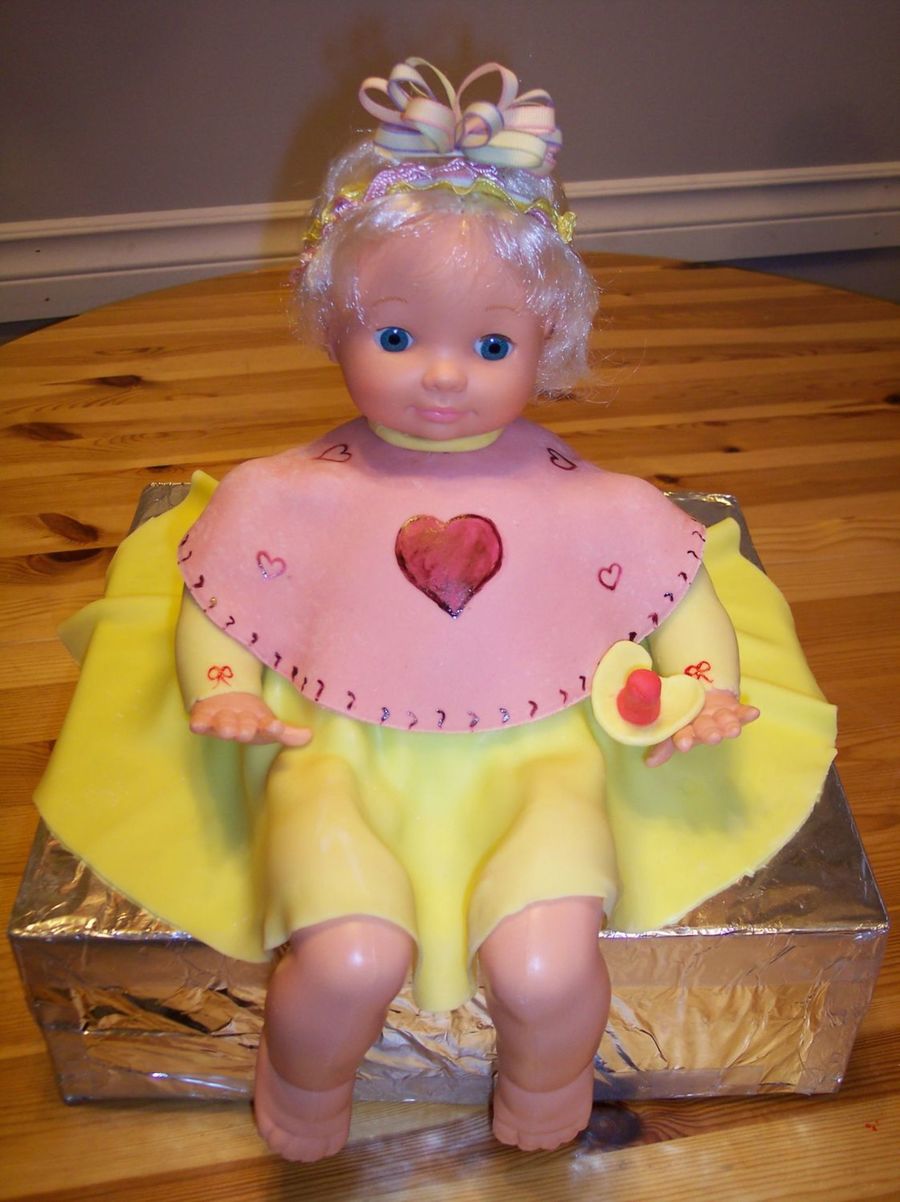 Thanks to denise2434 for the idea. Covered in fondant. Head, arms and legs are plastic. I made this for a cakewalk at my kids' school, everyone was afraid to win it because they didn't want to cut it!!