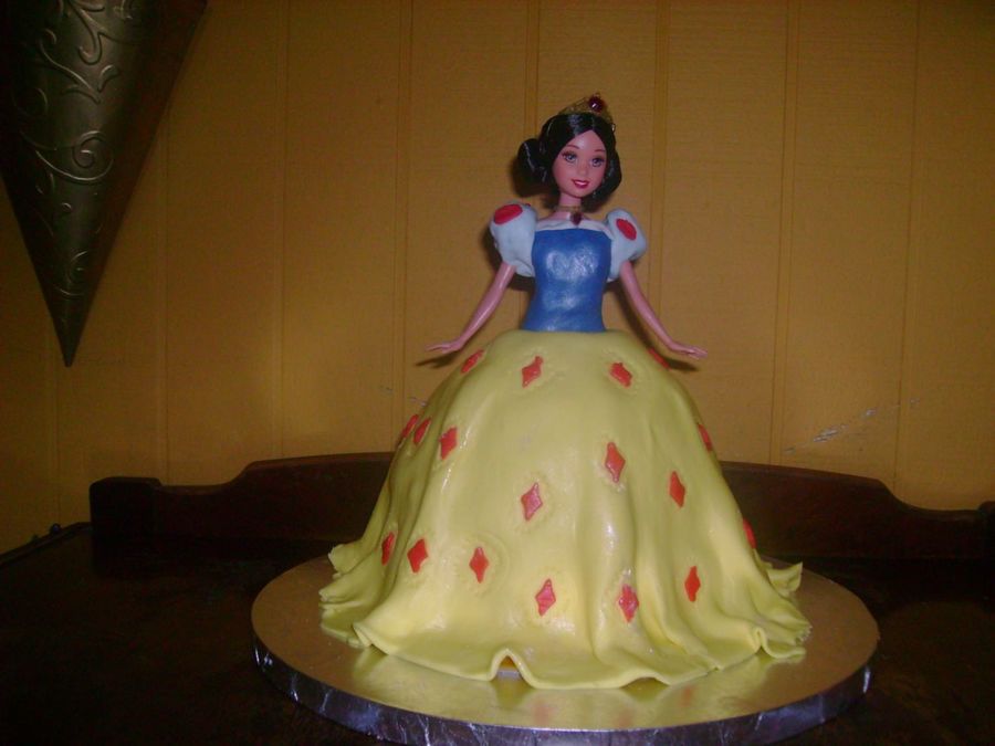 This cake is white cake for the skirt part and yellow cake for the 9 inch round layer underneath to give it more height because the doll is tall. I iced in buttercream then covered in fondant with fondant bodice,and accents. then i brushed the skirt part with super pearl luster dust.