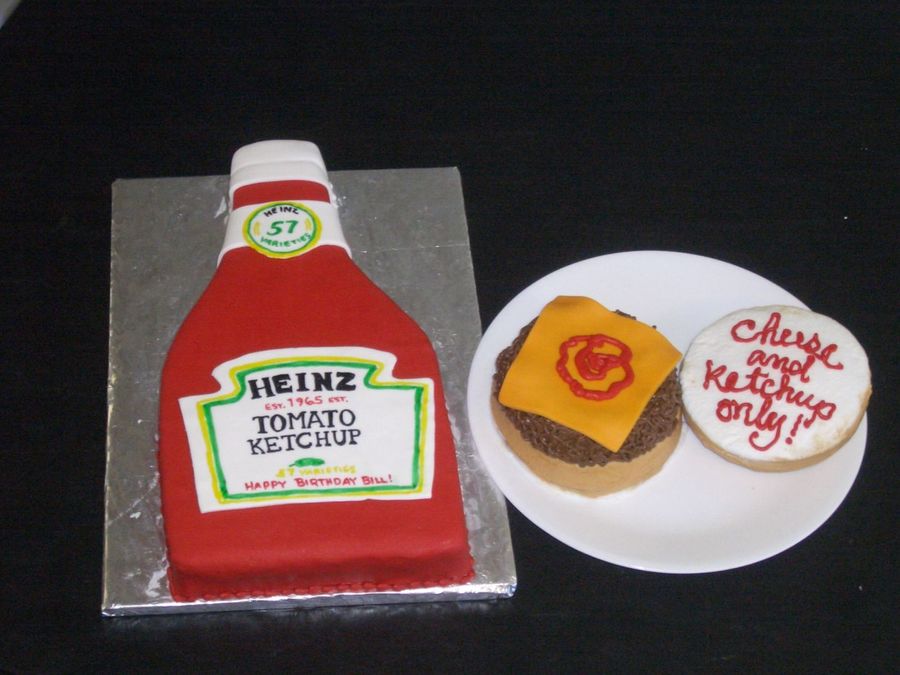 This cake was for the man who likes his burgers (his favorite meal of course) "Just Plain".....ketchup and cheese only please! The ketchup bottle is covered with fondant using food color pens for the label. the hamburger is done with buttercream frosting and fondant cheese.