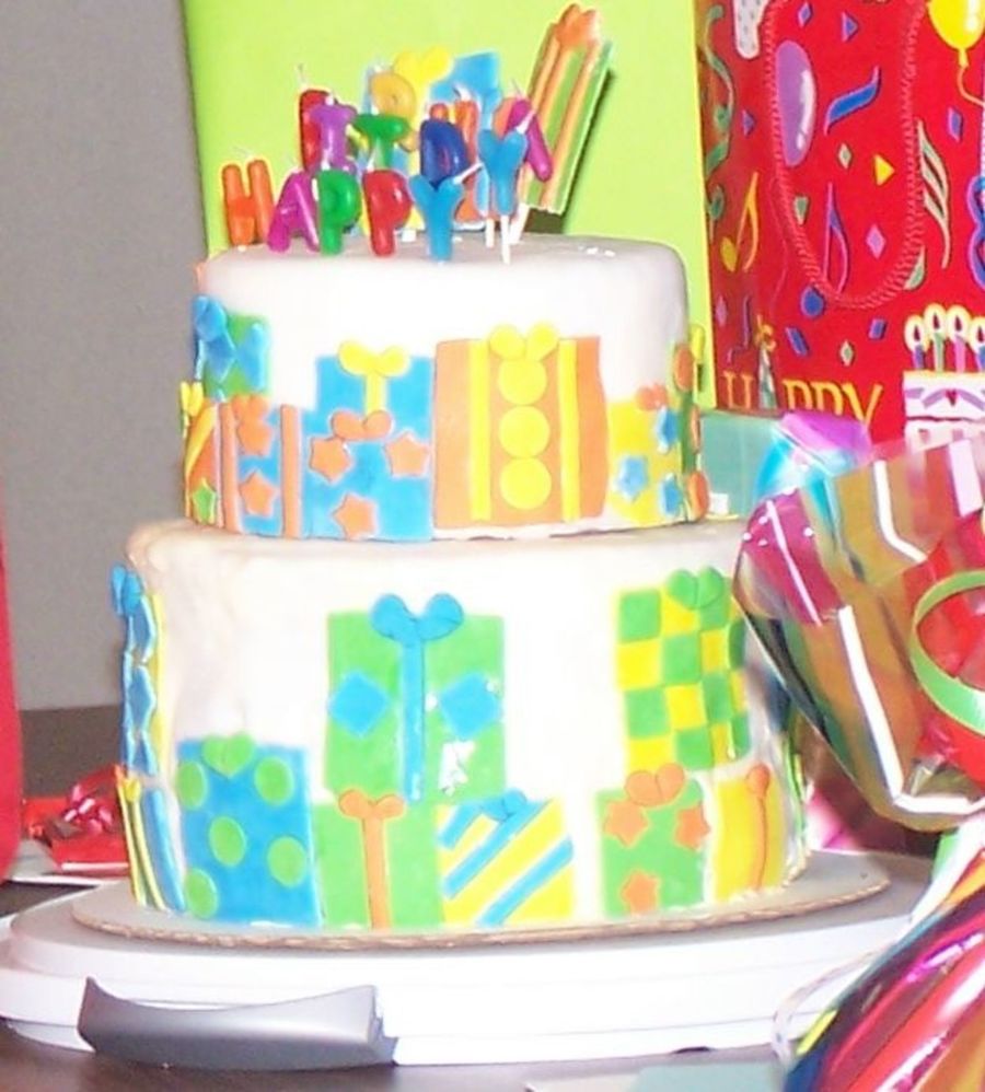 this is my cousins 8th birthday cake. i got this idea from the wilton celebrate with fondant book, it was pretty easy, i just started to run out of ideas for the patterns and stuff! it turned out ok i guess, this was my third fondant cake.