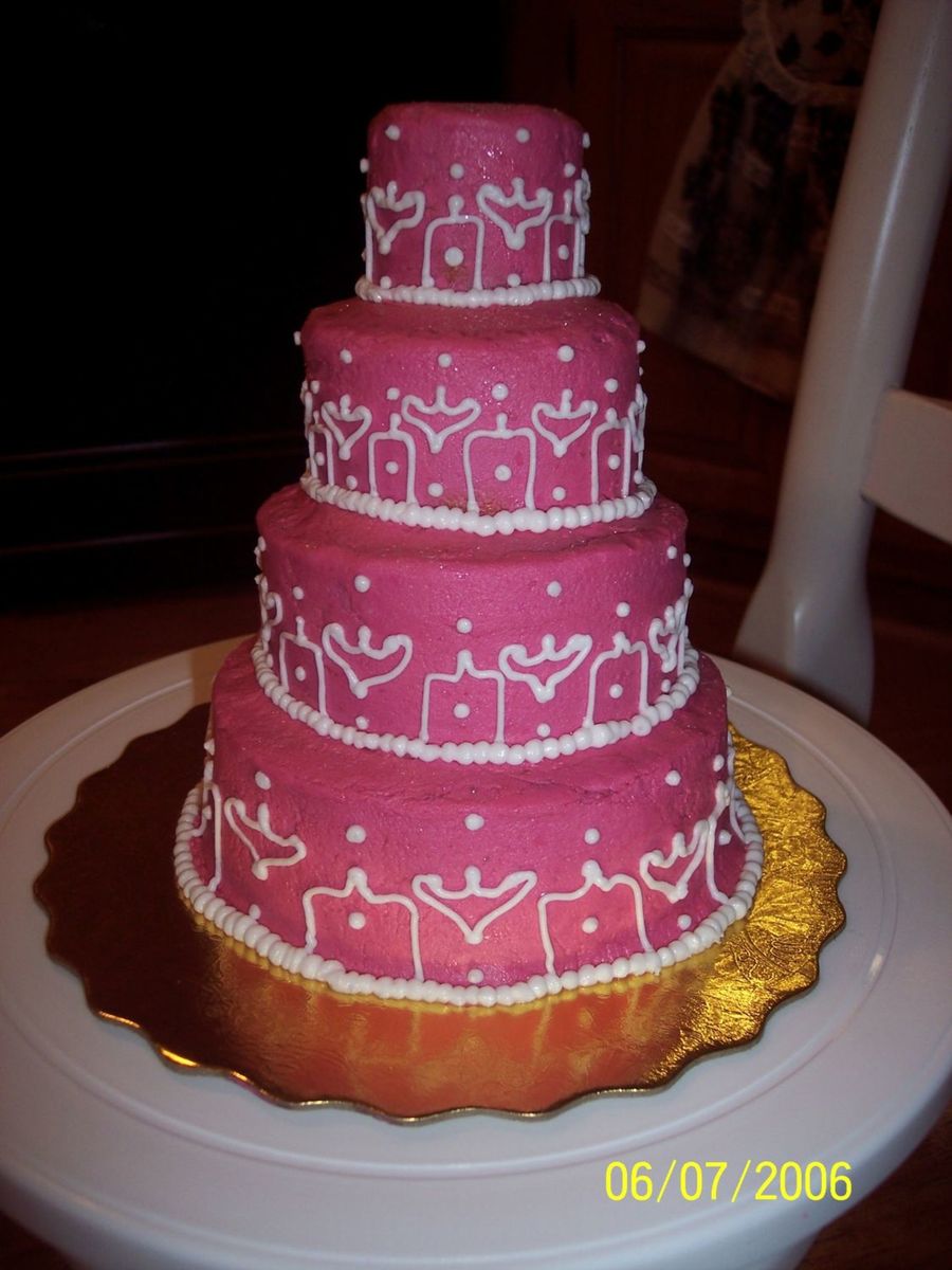 I did this cake for my husband's district manager, Kim. She always seems to miss cake day at my husband's store, so I made her a cake of her own. It's a mini-tiered cake (2", 3", 4", 5") with an Indonesian type design that I saw on a cake someone else on this website made a few weeks ago. It was my first time to do a lot of decoration on the side of a cake.