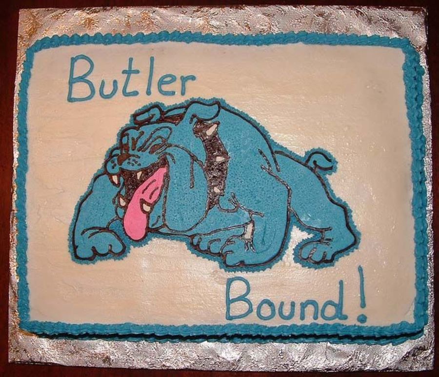 Graduation cake for high schooler headed to Butler college. Their mascot is a bulldog and their colors are blue and white. Bulldog is a BTC transfer