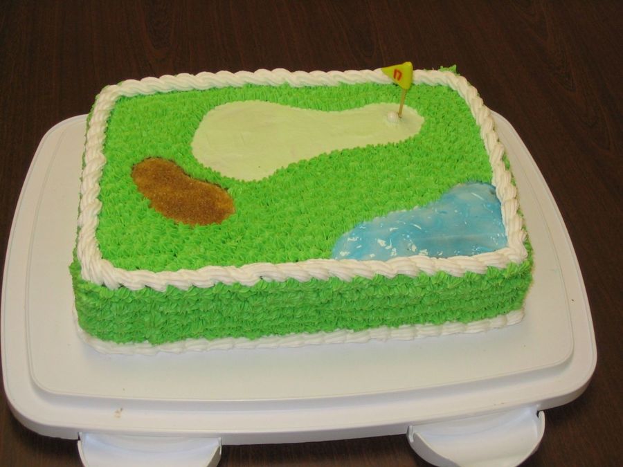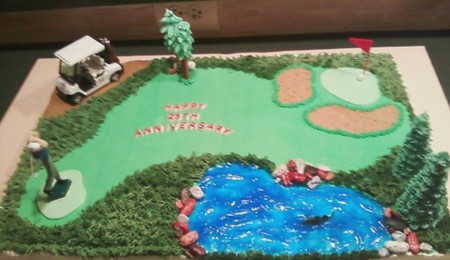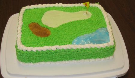 Made for a golf finatic! Sand is brown sugar. Water is colored piping gel. Flag is fondant.