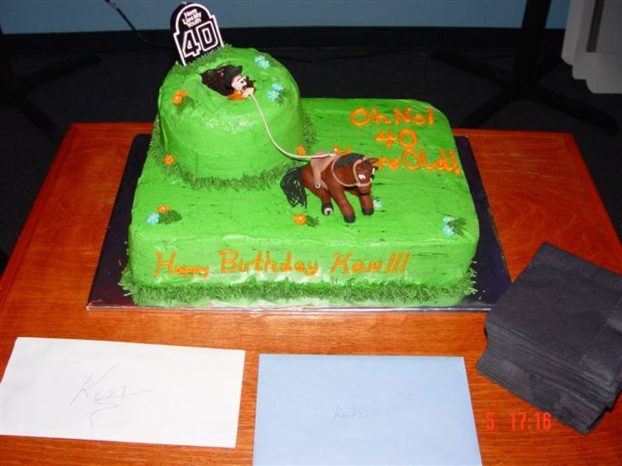 This was my first pay order cake. It was a double layer yellow/fudge marble with a chocolate cake hill. All BC icing except the horse and cowboy. I sculpeted them out of polymer clay. The cake ended up being huge, but the client was extremely happy!