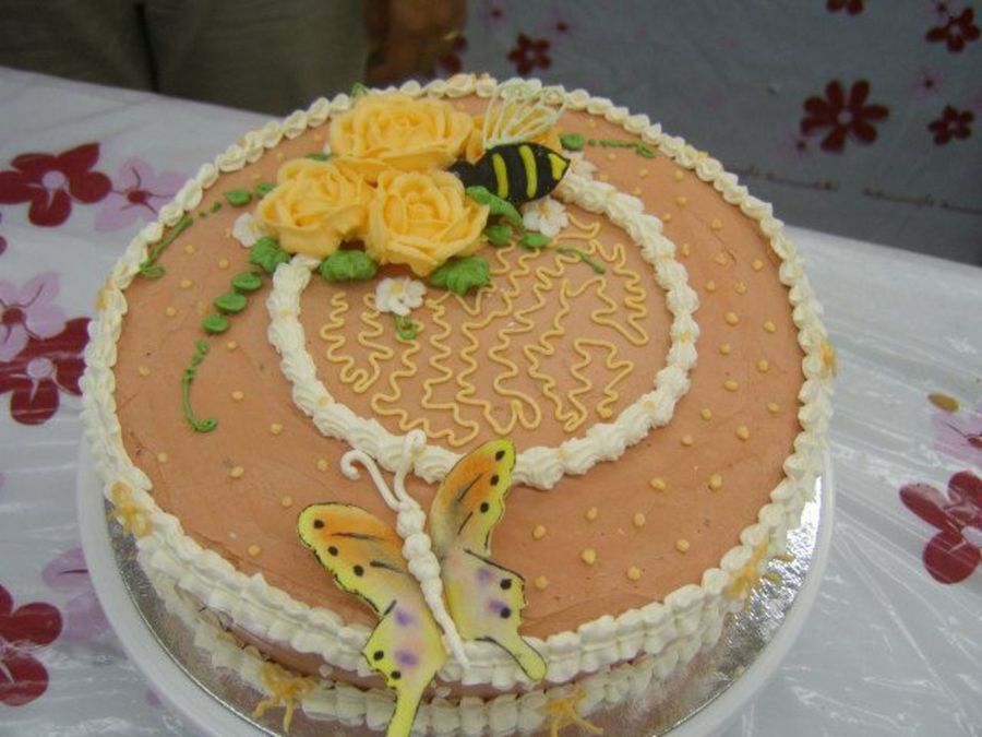 a cake I made at a competition an dwon the 2nd place!! BC roses, gumpaste butterfly and royal icing bee..
