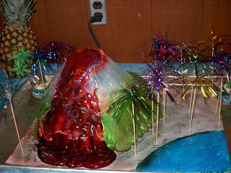 I did this cake back shortly before I finished Wilton 1, for my nephew's Luau-themed birthday party. I used the Wonder Pan for the top, overfilling it so it reached the maximum 8" diameter. For the base tier I used a 9"x3" round pan. The French Buttercream icing was piped on in a shell pattern, then smoothed slightly with a hot spatula to give it the texture you see in the side. The shell pattern was not smoothed beneath the raspberry filling/lava. The sides were airbrushed.
