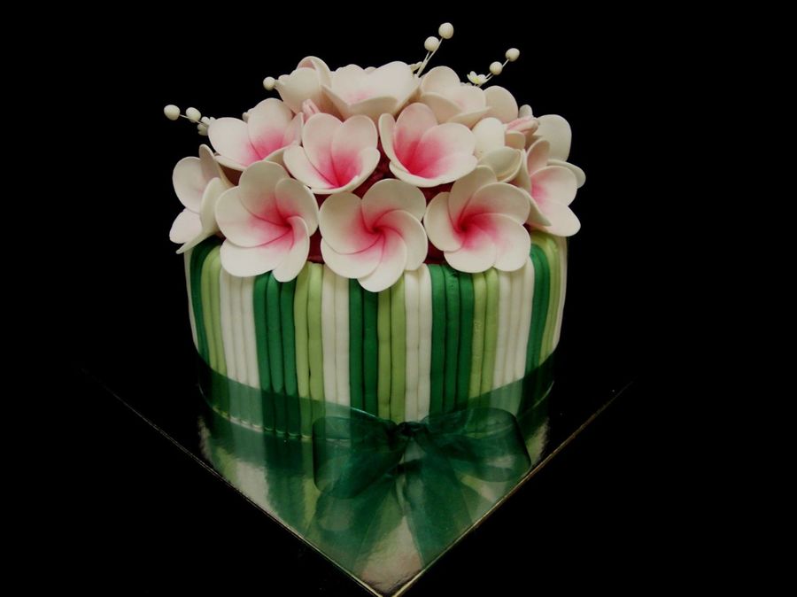 gumpaste frangipanis coloured with chalk and steamed to set the colour... hubby loves making these