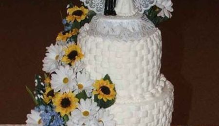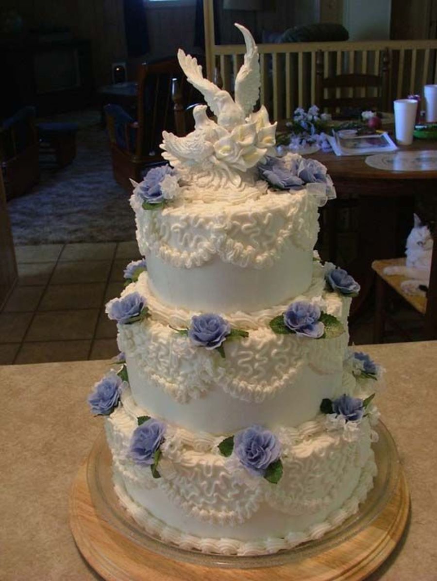 This is my second wedding cake. I don't have photos of the first one. On this one i used the white almond sour cream cake recipe and the white canned buttercream frosting from wiltons. This was for an outdoor reception in June. We kept the cake in a refrigerated aired camper until the last minute so it wouldn't melt. It worked great and everyone said it was the moistest cake they had ever tasted.