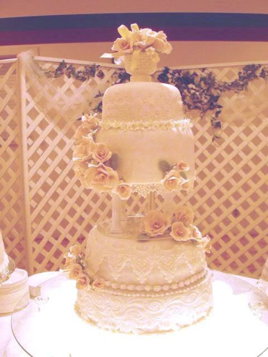 This is the cake I made for my daughter's wedding. It's covered with fondant and lace appliques. The roses are pale pink gumpaste. I made a sugar vase for the topper and filled it with more roses.