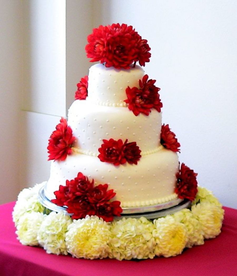 This cake was covered in white chocolate fondant and decorated with piped dots and fresh dahlias.