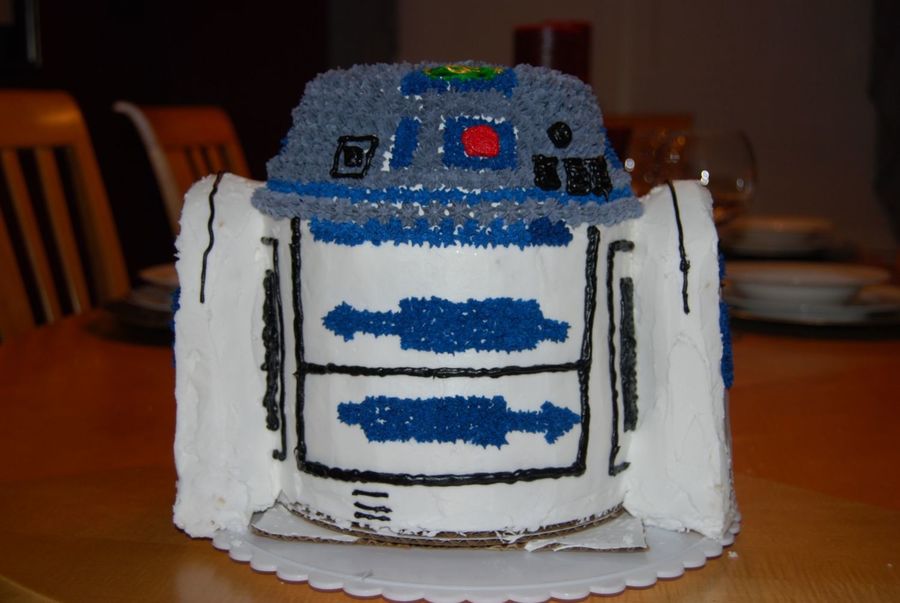 This is my R2D2 cake fro my brother's birthday. The legs are RKT and it is all covered in BC. Bottom is white with blueberry filling and top is choc. with oreo filling.