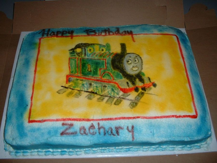 This cake was made for my cousin's 3 year old. I took the design off of the invintation. The only mistake was I sprayed the background yellow and wanted to color the train in blue like it is to be. Me the dum bell I can be forgot blue and yellow makes green. He didn't seem to mind though