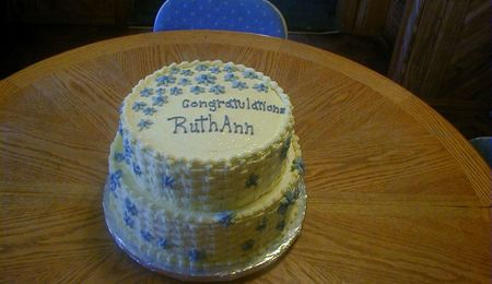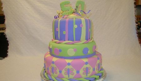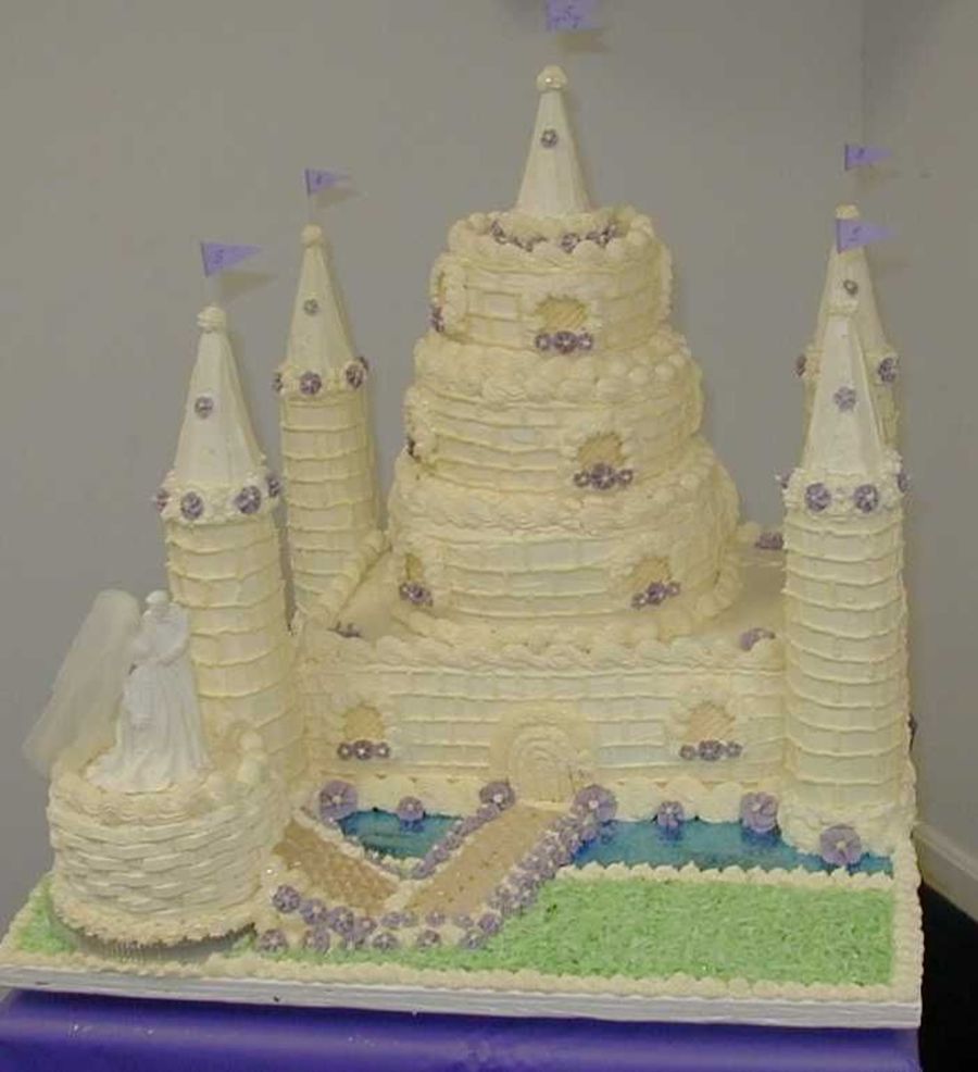 round cakes were 12",10" and 8" and the bottom one was 11x15 and 3 layers if I remember right. It was one of my first wedding cakes about 3 years ago. The blue is actually cellophane foil paper. The moat was my 8 year old sons idea.