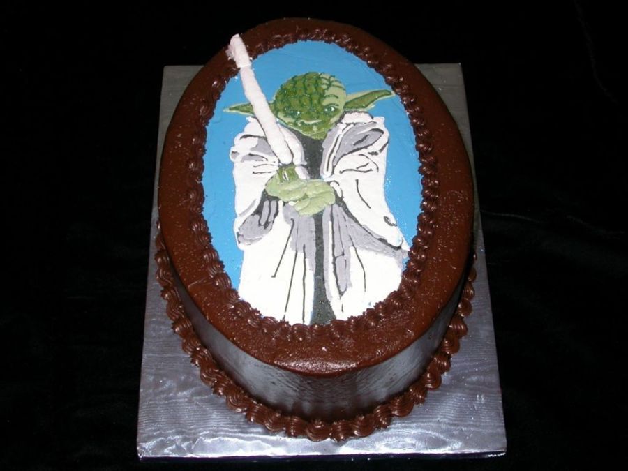 I made this for my 7 year old grandson. It was kind of big, but I needed the room to put Yoda and not have him crowded. Chocolate cake with chocolate syrup frosting and choc./choc. chip filling. I put a VERY thin layer of blue buttercream over the chocolate for the background and then used my kopykake projector to fill in Yoda. his face was pretty hard because I couldn't see it very well over the green icing, so I had to look at a picture, but even still it does RESEMBLE Yoda.